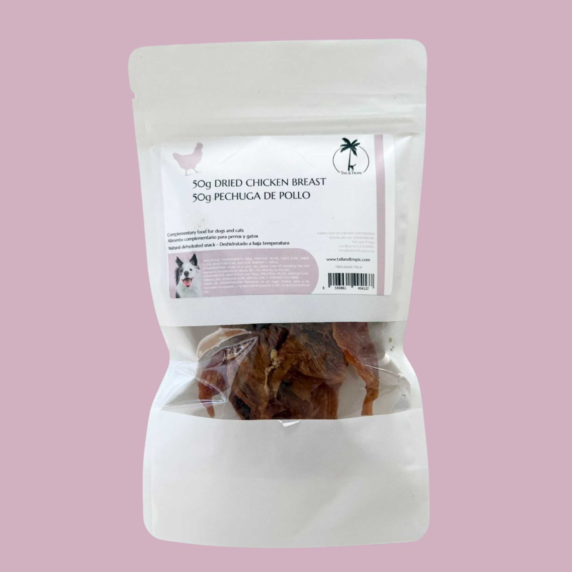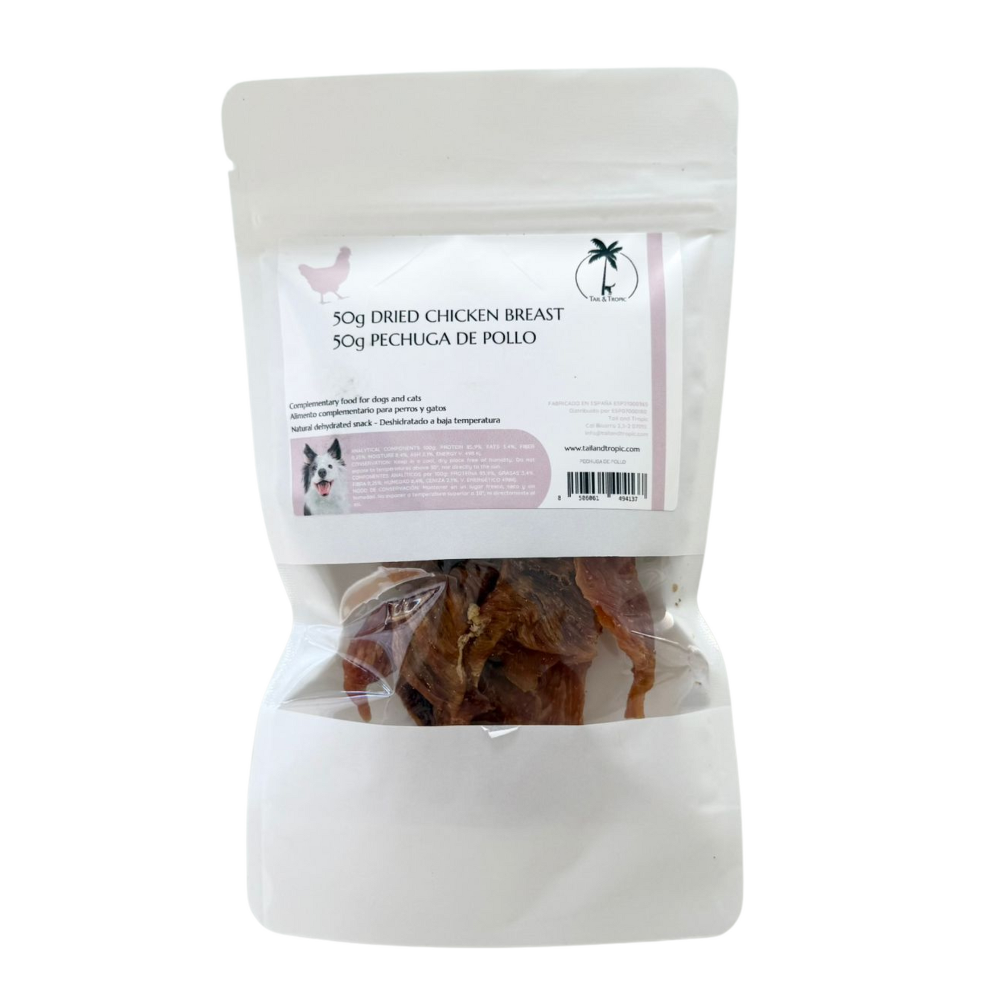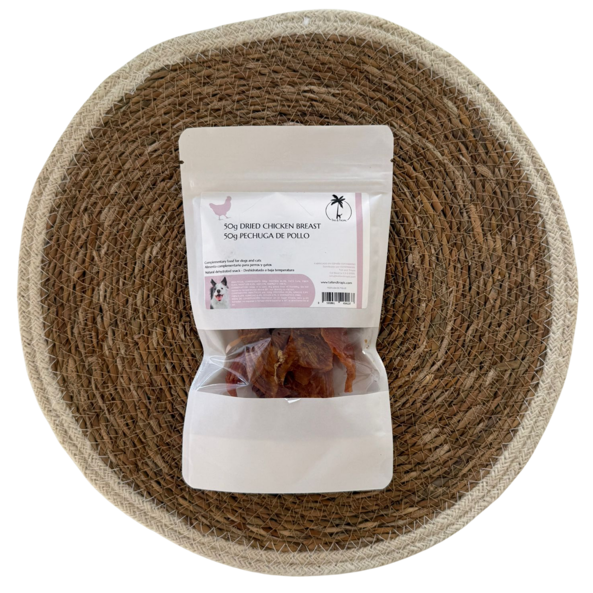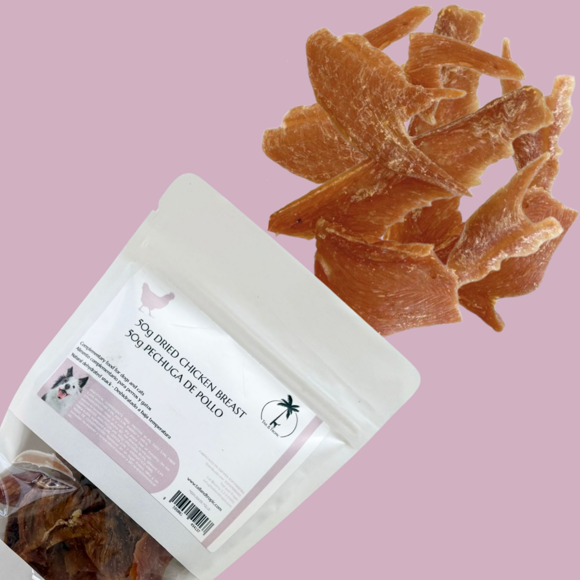 Discover our irresistible natural dog treat: 50grams of 100% natural dehydrated chicken breast.
