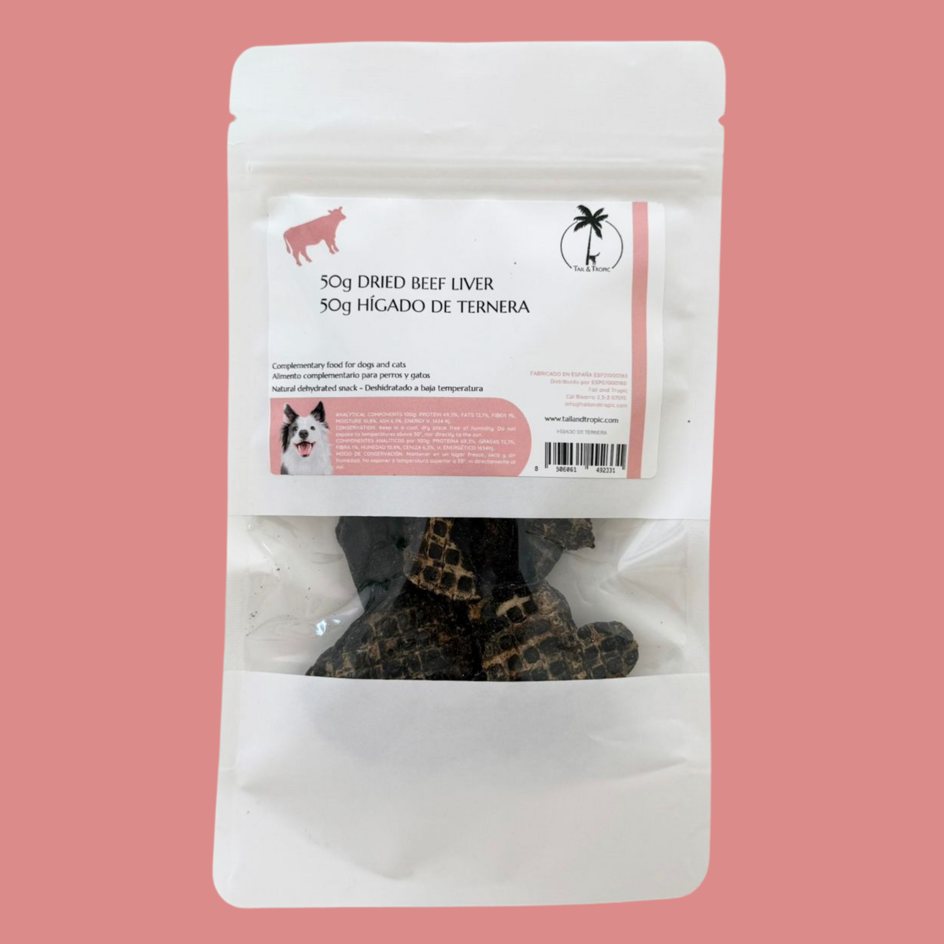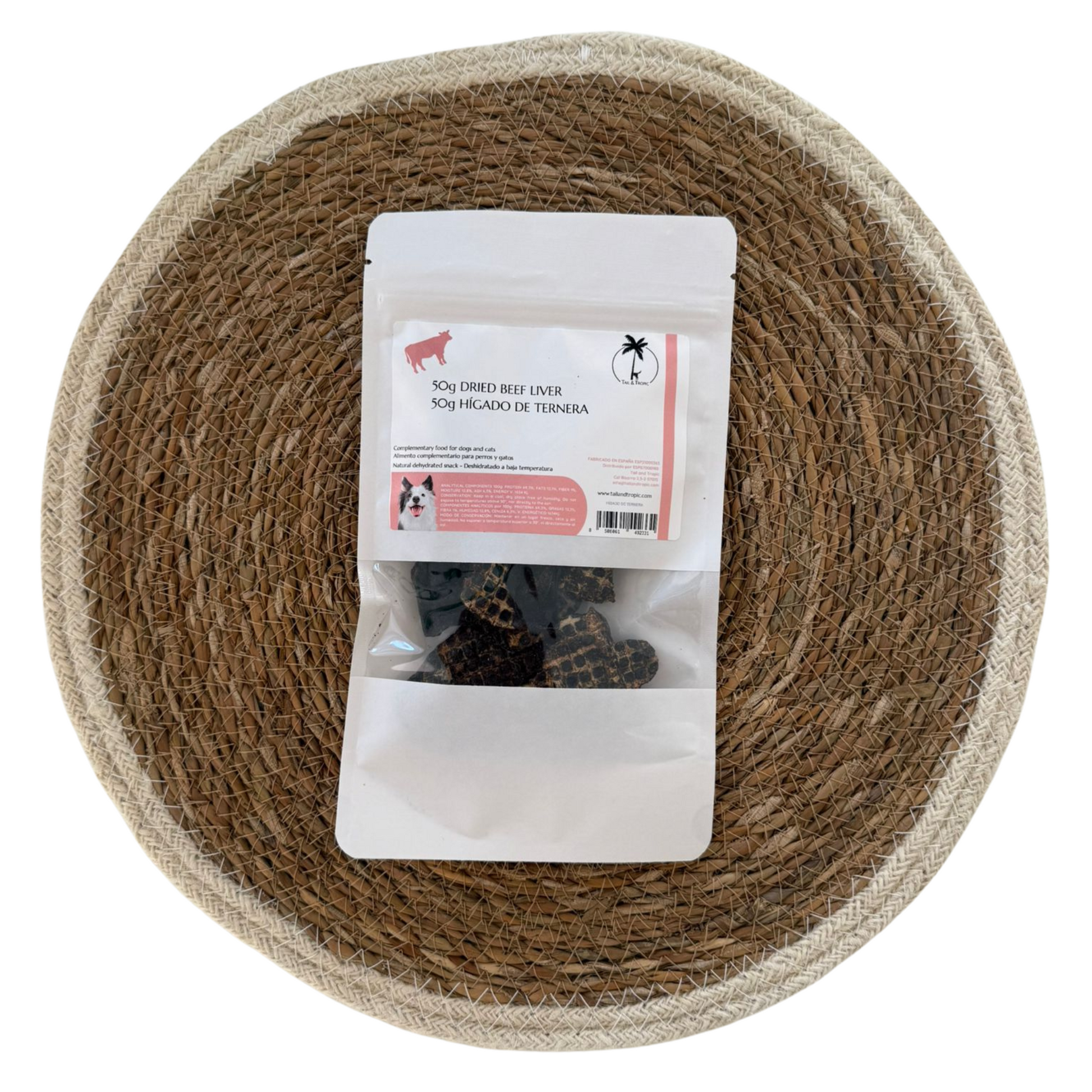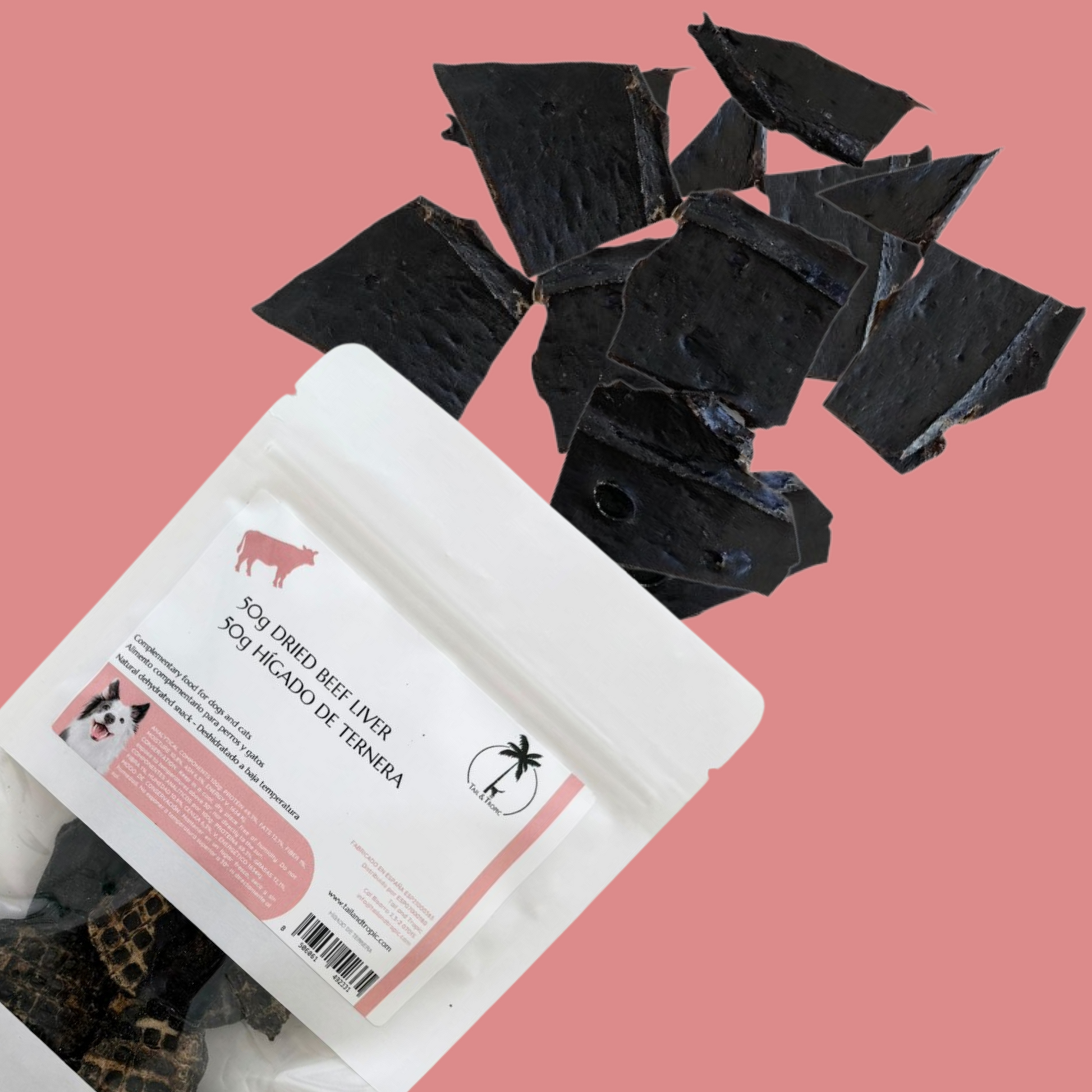 50g of 100% natural dehydrated beef liver – a natural source of proteins, fats, omega-3 and omega-6 fatty acids, as well as vitamins A and B. It also provides essential minerals like copper, iron, zinc, and phosphorus.