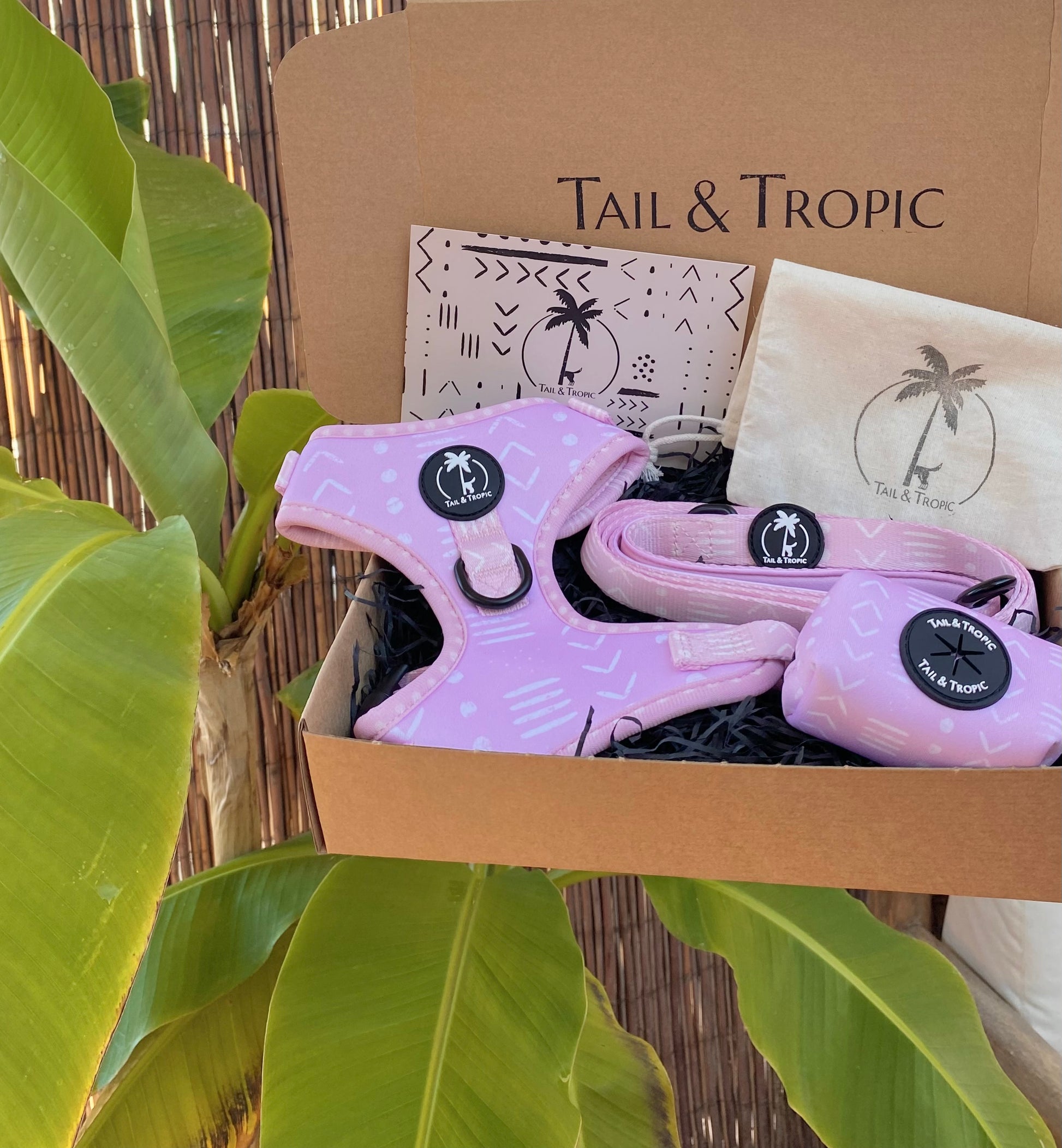 Our ONA Adjustable Harness combines both style and practicality, featuring a unique boho pattern inspired by the typical mediterranean bougainvillea flower, with a light pink design that complements any fur color.